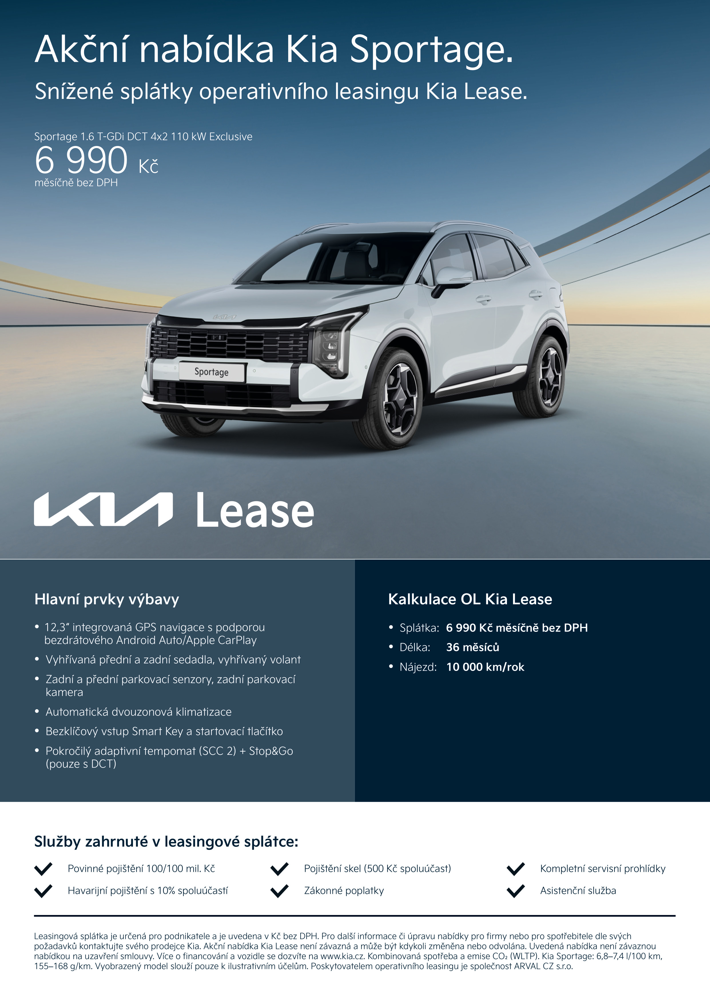 Měsíční splátka operativního leasingu činí 6 990 Kč bez DPH při délce leasingu 36 měsíců a nájezdu 10 000 km ročně.